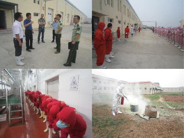 吉林德惠宝源丰禽业发生特大事故,造成120人遇难,在全国安全月伊始之时发生如此重大事故,教训惨痛。为吸取这一惨痛的经验教训,落实于董事长关于安全整顿的要求,进一步增强员工安全意识和自我救助能力,公司于2013年6月7日在各分厂车间、制冷机房和厂区空地三处演习地点举行了紧急疏散、液氨泄漏紧急处置和消防灭火的实战演练。